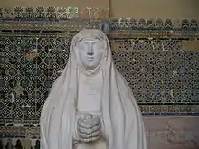 Cortés's wife Catalina Súarez arrived in New Spain around summer 1522, along with her sister and brother.[28] His marriage to Catalina was at this point extremely awkward, since she was a kinswoman of the governor of Cuba, Diego Velázquez, whose authority Cortés had thrown off and who was therefore now his enemy. Catalina lacked the noble title of doña, so at this point his marriage with her no longer raised his status. Their marriage had been childless. Since Cortés had sired children with a variety of indigenous women, including a son around 1522 by his cultural translator, Doña Marina, Cortés knew he was capable of fathering children. Cortés's only male heir at this point was illegitimate, but nonetheless named after Cortés's father, Martín Cortés. This son Martín Cortés was also popularly called "El Mestizo".[29][30]