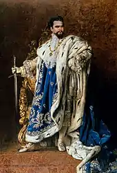 Ludwig II by Gabriel Schachinger. The posthumously finished painting is based on the famous Portrait of Louis XIV by Hyacinthe Rigaud and is exhibited in the Palace