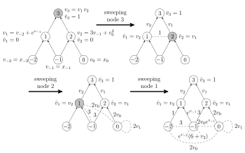 The algorithm's input is the computational graph of the function. After a preceding forward sweep where all intermediate values in the computational graph are calculated, the algorithm initiates a reverse sweep of the graph. Upon encountering a node that has a corresponding nonlinear elemental function, a new nonlinear edge is created between the node's predecessors indicating there is nonlinear interaction between them. See the example figure on the right. Appended to this nonlinear edge is an edge weight that is the second-order partial derivative of the nonlinear node in relation to its predecessors. This nonlinear edge is subsequently pushed down to further predecessors in such a way that when it reaches the independent nodes, its edge weight is the second-order partial derivative of the two independent nodes it connects.[2]