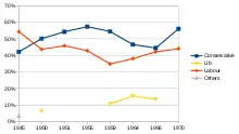 Its candidates returned were Conservative except for siding with the Labour Party's landslide victory which returned the Attlee Ministry (in 1945). Conservative Richard Reader Harris saw a slim 2.25% majority at the 1966 election which saw the start of the Second Wilson Ministry.