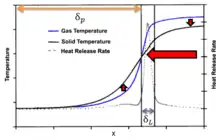 Within a combustion chamber containing porous media, structure of the environment can be assumed as follows. A preheating region exists prior to the surface of the flame front denoted by δp. Preheating length is marked by the beginning of the porous solid where appreciable heat transfer to the gas phase occurs and ends when the solid and gas phase reach equilibrium temperature. The region of chemical heat release, the flame, whose thickness can be given as δL, exists following the preheat region and its length is dependent upon mass flux, surface properties, and equivalence ratio. Beyond the flame, where minimal chemical heat release occurs, heat is convectively transferred from the post combustion gases into the solid. Heat then conducts and radiates through the solid structure upstream through the flame. Within the preheating region, heat is again convectively transferred from the solid structure to the gas.[5]