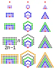 Hexagonal numbers should not be confused with centered hexagonal numbers, which model the standard packaging of Vienna sausages. To avoid ambiguity, hexagonal numbers are sometimes called "cornered hexagonal numbers".
