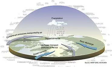 The Arctic is comparatively clean, although there are certain ecologically difficult localized pollution problems that present a serious threat to people's health living around these pollution sources. Due to the prevailing worldwide sea and air currents, the Arctic area is the fallout region for long-range transport pollutants, and in some places the concentrations exceed the levels of densely populated urban areas. An example of this is the phenomenon of Arctic haze, which is commonly blamed on long-range pollutants. Another example is with the bioaccumulation of PCB's (polychlorinated biphenyls) in Arctic wildlife and people.