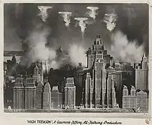 High Treason is a 1929 film[1] based on a play by Noel Pemberton Billing. It was directed by Maurice Elvey, and stars James Carew, Humberstone Wright, Benita Hume, Henry Vibart, Hayford Hobbs, Irene Rooke, and Jameson Thomas.[2] Raymond Massey makes his first screen appearance in a small role. The film was initially produced as a silent but mid-way during production, Elvey was pushed by the studio to add sound to the film in order to cash in on the talkies. Although a third of the film was filmed in sound, Elvey maintained much of the silent footage and dubbed over the dialogue for shots that were originally silent, with Elvey himself voicing some of the minor characters, which he admitted when interviewed by the Manitoba Free Press shortly after the film was released in the US. [3] Likewise, BIP's Blackmail, directed by Alfred Hitchcock was also turned into a sound picture mid-way during production (concurrently when High Treason was also in production) and many of the silent scenes used dubbed dialogue and sound effects in a similar fashion to High Treason.