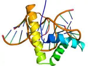 In molecular biology, the HMG-box (high mobility group box) is a protein domain which is involved in DNA binding.[1] The domain is composed of approximately 75 amino acid residues that collectively mediate the DNA-binding of chromatin-associated high-mobility group proteins. HMG-boxes are present in many transcription factors and chromatin-remodeling complexes, where they can mediate non-sequence or sequence-specific DNA binding.[2]