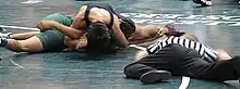 - Win by technical fall: If a fall is not secured to end the match, a wrestler can win a match simply by points. If a wrestler can secure an advantage of 15 points over an opponent, then the wrestler can win the match by "technical fall".[54] A technical fall is very likely when one wrestler has great control over the other wrestler and is able to score near fall points repeatedly. If the 15-point advantage is gained while the offensive wrestler has his opponent in a pinning situation, the match would continue to allow the offensive wrestler to secure the fall. If the offensive wrestler is unable to secure a fall, the match ends once a near fall situation is no longer seen by the referee or when the wrestlers return to the neutral position.