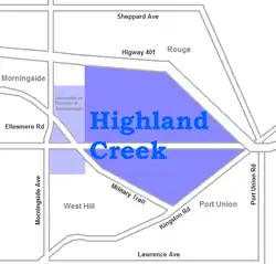 Highland Creek is a neighbourhood in eastern Toronto, Ontario, Canada.[1] It is located along the southern portion of the river of the same name in the former suburb of Scarborough. To the east are the neighbourhoods of Port Union and West Rouge, to the west West Hill and Woburn, and to the south Centennial Scarborough.
