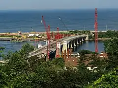 Between 2008 and 2011, the new fixed-span bridge was constructed to replace the aging drawbridge.[2][3] The new bridge is 75 ft tall (23 m) and consists of two individual 1,610-foot-long spans (490 m) resting on nine hollow precast concrete columns. The spans are made of approximately 150 precast, post tensioned concrete box girders weighing between 30 and 70 tons each and achieve spans nearly twice the length of the steel spans of the original bridge. Because the new bridge was built in place of the old bridge, workers needed to demolish half of the old bridge and then construct half of the new bridge. After the first half of the new bridge was completed traffic was shifted to the new span, and the other half of the old bridge was demolished, making way for the second half of the new bridge. Construction of the new bridge began in February 2008 and was opened to traffic in December 2010. The entire project was completed in the spring of 2011. A ribbon-cutting ceremony occurred on May 1, 2011 to dedicate the newly constructed bridge. Several state and local officials attended the ceremony.[4]