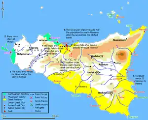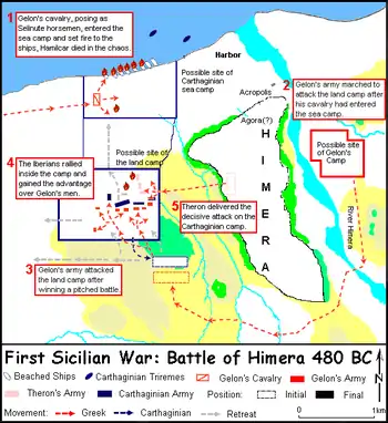 The magnitude of the armament sent under Hamilcar, who is said to have landed in Sicily with an army of 300,000 men, sufficiently proves that the conquest of Himera was the pretext, rather than the object, of the war. However, it is likely that the growing power of Himeria in the immediate vicinity of the Carthaginian settlements of Panormus and Solus had already caused concern among the Carthaginians. Hence it was against Himera that the first efforts of Hamilcar were directed. Theron, who had thrown himself into the city with all the forces at his command, was able to maintain its defence until the arrival of Gelon of Syracuse. Despite the numerical inferiority of his forces, he defeated the army of the Carthaginians with such slaughter that the Battle of Himera in 480 BC was regarded by the Greeks of Sicily as worthy of comparison with the contemporary victory of Salamis.[6] The same feeling probably gave rise to the tradition or belief, that both triumphs were achieved on the very same day.[7]