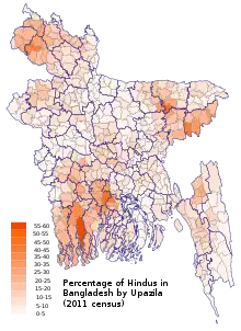 According to the 2001 Bangladesh census, there were around 11.82 million Hindus in Bangladesh constituting 9.6% of the population, which at the time was 123.15 million.[24] The Bangladesh 2011 census states, that approximately 12.73 million people responded that they were Hindus, constituting 8.54% of the total 149.77 million.[25] While 2022 Census of Bangladesh, put the number of Hindus in Bangladesh at 13.1 million out of total 165.1 million population, thus constituting 7.95% of the population.[1] According to a report published by a local daily newspaper of Bangladesh, the Hindu population in the country has reduced by nearly one million between 2001 and 2011 period.[26] The reduction mainly happened in nine districts – Bhola, Barisal, Jhalokati, Pirojpur, Bagerhat, Narail, Gopalganj, Rajbari and Manikganj.[27] The United States Commission on International Religious Freedom have said that Hindus constitute merely 7% of the population in Bangladesh as per as the latest 2016 figures.[28] Hindus in Bangladesh in the late 2000s were almost evenly distributed in all regions, with large concentrations in Gopalganj, Dinajpur, Sylhet, Sunamganj, Mymensingh, Khulna, Jessore, Chittagong and parts of Chittagong Hill Tracts. In the capital city of Dhaka, Hindus are the second-largest religious community after the Muslims and the largest concentration of Hindus can be found in and around Shankhari Bazaar of the old city.