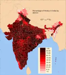 The Hindu population has increased more than three times from 303,675,084 in 1951 to 966,257,353 in 2011, but the Hindu percentage share of total population has declined from 84.1% in 1951 to 79.8% in 2011.[20][21] When India achieved independence in 1947, Hindus formed 84% of the total population and pre-Partition British India had 73% of Hindus.[22]