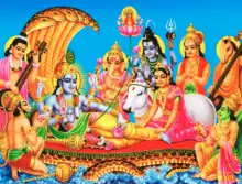 Perumal (Tamil: பெருமாள்), also rendered Thirumal, is a form of Vishnu worshipped in the Sri Vaishnava tradition. He is also venerated by the epithets of Narayana, Varadharaja, Rangaraja, Ranganatha, Kallalagar, Govindaraja, and several others in his temples scattered throughout the Tamil country. Originally venerated as the god of the forests, Perumal was assimilated with Vaishnavism, having earlier conceived been as either a pantheistic or a monotheistic divinity. Through the concept of bhakti, first introduced to the region by the Alvars, Vaishnavism became among the oldest faiths to influence the Tamil people.[70] The deity, and his consort Lakshmi, as well as her aspects of Sridevi, Bhudevi, and Niladevi, are primarily venerated, and are also represented as the Dashavatara in Perumal temples in Tamil Nadu. He is the deity who is primarily addressed in the Naalayira Divya Prabandham, a compilation of works by the Alvar saints, whose philosophy and hymns were propagated in the works of Ramanuja, Manavala Mamunigal, and Vedanta Desikan.[71] The largest Hindu temple in India is dedicated to Perumal in his form of Ranganathaswamy, situated at Srirangam.[72] The Alvars influenced the establishment of the Divya Desams, 108 shrines of Perumal that were glorified in their works, which continue to be visited as major shrines of pilgrimage by Tamil Vaishnavas.[73]