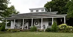 The Hiram Palmer House is a historic house located at 703 East Fort Street in Farmington, Illinois. Hiram and Philynder Palmer built the house in 1851–52 but sold it the year it was completed. In 1856, the house was purchased by Riley Bristol, a local pharmacist and founder of Farmington's First Congregational Church; Bristol lived in the house until 1882. The house has a Greek Revival design, a nationally popular stylistic choice in the first half of the nineteenth century. The wraparound front porch is supported by Tuscan columns. The house's low hip roof features a plain frieze and cornice at the roof line and is topped by a lantern with a cornice and pediment. The house's interior features decorative Greek Revival woodwork, including carved door and window moldings, ornamental panels by the windows, and a fireplace mantel supported by pilasters.[2]
