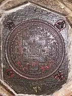 The first sculpture one encounters in the courtyard is a Dharmadhatu mandala on a lotus pedestal, with a vajra on top. Until recently it was protected by a canopy with prayer wheels attached to the supports. There is another vajra on the opposite side of the courtyard in front of the main shrine, next to a fire pit.[4][8]