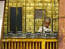 At the end there is another richly adorned gate, which gives access to the courtyard. Apart from the abundance of Buddhism related sculptures, some Hindu sculptures can be seen here. Incarnations of Vishnu en Shiva, for instance, appear as roof struts that support the roof above the gate. Having passed this second arch, one enters a small vestibule with sculptures of Mahakala and Ganesha on the wall.[4] Images of Mahakala and Ganesha, protectors of the other gods of the Kathmandu Valley, guarding the entrance of a vihara is a regular occurrence in Nepal.[9]