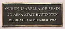 Sculptor Anna Hyatt Huntington created and donated a bronze sculpture of Queen Isabella.[7]