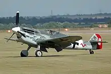 The final variant was the HA-1112-M1L Buchón (Pouter), which is a male dove in Spanish. It first flew on 29 March 1954 with a 1,600 hp Rolls-Royce Merlin 500-45[4] engine and Rotol propeller, both purchased as surplus from the UK.[4] This engine had a chin intake that altered the lines of the Bf 109's airframe. It was an improvised assembly of outdated components but this was appropriate for the intended purpose of controlling Spanish colonial territories in Africa, where more sophisticated technology was both unnecessary and unavailable in isolated Spain at the time. It carried two 20 mm Hispano-Suiza 404/408 cannons and two Oerlikon or Pilatus eight-packs of 80 mm rockets and remained in service until 27 December 1965.