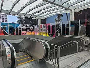 The station's glass entry pavilion is wrapped in Andrea Bowers' The People United (“El pueblo unido jamás será vencido,” Sergio Ortega and Quilapayun; “Brown Beret 13 Point Political Program,” La Causa) which features text artwork of revolutionary slogans such as “El pueblo unido jamás será vencido” (the people united will never be divided) and “By independence we mean the right to self-determination, self-government and freedom.” According to Metro Art, "the first text is often heard chanted at marches and political demonstrations around the world; it originated in Chile between 1969 and 1973 in support of Salvador Allende’s presidential election and evolved into an anthem composed by Sergio Ortega for the Chilean Popular Unity coalition. The second is taken from a mission statement of the Brown Berets, a Chicano civil rights group founded in East Los Angeles and active during the late 1960s and early 1970s."[7]