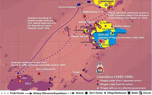 - 1945 - Filipino soldiers of the 6th, 10th and 102nd Infantry Division of the Philippine Commonwealth Army was landing the beaches and liberated the island and helpful to the local Christian and Muslim guerrilla fighters and American soldiers and defeating Japanese Imperial forces