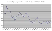 Having lost O'Rourke as manager in 1921, after he had struggled to cope with the death of his son two years earlier,[30] Bradford's results suffered back in Division Two. Both Bradford City and Bradford (Park Avenue) had been relegated in 1922, and with the rise of fellow West Yorkshire side Huddersfield Town, attendances in Bradford dropped. City's average attendance fell from a record high of 22,585 in 1920–21 to between 12,000 and 14,000 in Division Two.[31] Five consecutive bottom half finishes culminated in relegation to Division Three (North) in 1926–27,[28] when they finished bottom of the table following a then record 8–0 defeat to Manchester City on the final day of the season.[31] New manager Colin Veitch missed out on guiding the club to an immediate promotion when they finished sixth,[32] but at the end of the season the players had not been paid and the bank was unable to advance any more money because of the club's overdraft. Had it not been for donations by fans, Bradford City would not have started the following campaign.[33] A new board was appointed, and they reinstated Peter O'Rourke as manager.[32] Success was immediate, when the 1928–29 season started with a record 11–1 victory over Rotherham United,[15] as the side scored a club record 128 goals to earn promotion by just one point.[15][32] City's successful team had also brought the fans back and the average attendance of 18,551 is the highest average recorded by the club, since 1925, when The Football League started to keep official records.[26]