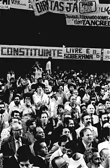 The party presented Neves as an opposition candidate against Paulo Maluf.[10] Neves was elected by a majority vote of the Parliament on January 15, 1985.[11] However, Neves collapsed the night before his inauguration in March, and died on April 21, so the presidency passed to Vice President José Sarney (president, 1985–90), long-time supporter of the military regime. The hope that 1985 would provide a quick transition to a new regime faded as Brazilians watched the turn of events in a state of shock. Like the regime changes of 1822, 1889, 1930, 1946, and 1964, the 1985 change also proved to be long and difficult.
