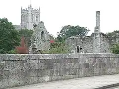In 1094 a chief minister of William II, Ranulf Flambard, then Dean of Twynham, began the building of a priory on the site of the original mission church.[11][18] Local legend tells that Flambard originally intended the church to be built on top of nearby St. Catherines Hill but, during the night, all the building materials were mysteriously transported to the site of the present priory. This 'miracle' is cited as one of the reasons the town became known as Christchurch.[19] On 28 November 1539, John Draper the last prior of Christchurch, surrendered the priory, and it was dissolved. The monastic buildings of the priory were pulled down soon after the dissolution. The King had intended to pull down the church as well as the monastic buildings, but in response to a plea from the townspeople, supported by Prior Draper, he granted the church together with the churchyard to the churchwardens and inhabitants of Christchurch to be used as the parish church in perpetuity on 23 October 1540, a grant that was confirmed on 12 February 1612 by James I. The town is fortunate that the Christchurch Priory cartulary, which consists of over 1,300 documents and charters copied and collated in the 14th century, with a few later additions, has survived to provide a comprehensive account of the Priory and events connected to it during the medieval period. A full translation was published in 2007.[20] The evolution of the Priory into the building it is today took place over many centuries: The nave and transepts are Norman with heavy columns and round arches, whereas the lady chapel is from the 14th century and more Perpendicular in style. The great choir is even later, having been rebuilt in the 16th century. The Priory is noted for its Miraculous Beam, which attracts pilgrims from all over the world.[7] From the reign of Edward I, after mass on Sundays, the church wardens supervised the archery practice that all men were obliged to undertake. This event took place on a piece of unconsecrated land between the north porch and transept. The requirement for the men of the town to practise archery continued until Tudor times.[21]