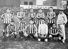 In 1914 River won its first domestic championship, the Copa de Competencia Jockey Club after beating Newell's Old Boys by 4–0 at the final, also finishing unbeaten.[12] River also won its first international title, the Tie Cup against Uruguayan team Bristol F.C. The line-up for that final was: Isola; Chiappe, Lanata; Peruzzi, Cándido García, Alfredo Elli; Fraga Patrao, Martín, Penney, Gianetto, Sevesi.[13]