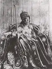 In early 1868, the British force seeking Tewodros’ surrender, after he refused to release imprisoned British subjects, arrived on the coast of Massawa. The British and Dajazmach Kassa came to an agreement in which Kassa would let the British pass through Tigray (the British were going to Magdala which Tewodros had made his capital) in exchange for money and weapons. Surely enough, when the British completed their mission and were leaving the country, they rewarded Kassa for his cooperation with artillery, muskets, rifles, and munitions, all in all worth approximately £500,000.[62] This formidable gift came in handy when in July 1871 the current emperor, Emperor Tekle Giyorgis II, attacked Kassa at his capital in Adwa, for Kassa had refused to be named a ras or pay tribute.[63] Although Kassa's army was outnumbered 12,000 to the emperor's 60,000, Kassa's army was equipped with more modern weapons and better trained. At battle's end, forty percent of the emperor's men had been captured. The emperor was imprisoned and would die a year later. Six months later on 21 January 1872, Kassa became the new emperor under the name Yohannes IV.[64]