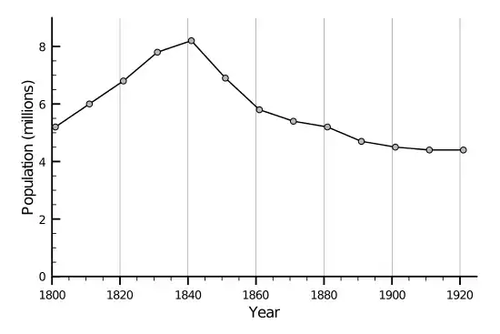 The economic problems of most Irish people were in part the result of the small size of their landholdings and a large increase in the population in the years before the famine.[5] In particular, both the law and social tradition provided for subdivision of land, with all sons inheriting equal shares in a farm, meaning that farms became so small that only one crop, potatoes, could be grown in sufficient amounts to feed a family.[6] Furthermore, many estates, from whom the small farmers rented, were poorly run by absentee landlords and in many cases heavily mortgaged. Enclosures of land since the start of the 19th century had also exacerbated the problem, and the extensive grazing of cattle had contributed to the decrease in size in the plots of land available to tenants to raise their crops.