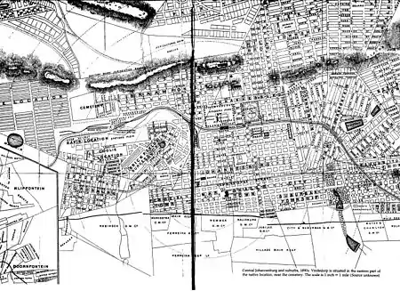 In October 1887 the government of the ZAR bought the south-eastern portion of the farm Braamfontein. Quite a big stream flowed along the farm and they intended selling the water to the residents of Johannesburg. But there were also large quantities of clay, suitable for brickmaking, along the stream. The government decided that more money was to be made from issuing brick maker's licences at five shillings per month.[26] The result was that many landless Dutch-speaking burghers (citizens) of the ZAR settled on the property and started making bricks. They also erected their shacks there. Soon the area was known either as Brickfields or Veldschoendorp.[27] Soon other working poor, "Malays, Coolies and Kaffirs" also settled there. The government, who sought to differentiate the white working class from the black, laid out new suburbs for the Burghers, Indians, Coloureds and Africans, but the whole area simply stayed multiracial.[24]