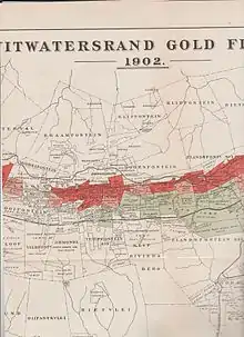 The earliest mining activities were concentrated along and adjacent to the outcrops of the main reef. Initially the diggers could perform the work themselves, using relatively little equipment. As the pits grew deeper, they needed additional labourers and machinery. Black Africans were recruited to perform the unskilled work. Machinery had to be imported from Europe and fuel had to be found to power the machinery.[7] The discovery of coal on the far east Rand at Springs and Boksburg, as well as the construction of the Rand Steam Tram from the colliery to the gold fields and into Johannesburg facilitated the growth of the industry in its early years.[8] Soon, too, the railway arrived from the coast: in September 1892 the Cape railway reached the Rand. Two years later the line from Lourenço Marques (now Maputo) arrived in the Republic and a third route was opened from Durban the next year.[9] In 1890 the MacArthur-Forrest cyanidation process successfully overcame the problems of treating the refractory ore from deeper levels.[10]