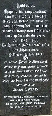 Very little is known about the British concentration camp in Turffontein Johannesburg.[67] It was apparently constructed on the site of the Turffontein Turf Club, which was started in 1887 and still exists at the same place. Those who died at the concentration camp were buried at a cemetery where the suburb Suideroord was laid out many years later. The location is 26°16.357'S, 28°01.638'E. The site still exists, but it is surrounded by palisade fencing and the gates are securely locked. The cemetery was vandalized at the beginning of the Second World War, with the result that the gravestones were replaced by a memorial. The memorial is in the shape of seven coffins. One marble slab, erected on 10 October 1957, records that it replaced a marble slab that had also been vandalized in March 1957. Another records that 716 persons who had died in the concentration camp, were buried in that cemetery.