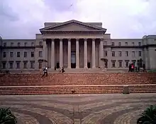 In 1902 Lord Milner also issued a proclamation establishing two supreme courts in the Transvaal. The one intended to serve the Witwatersrand gold fields was initially called the Witwatersrand District Court.[68] Later it was called the Transvaal High Court. Although the opening of the court was anticipated for 20 May 1902, the High Court building was only inaugurated in 1910.[69] The stained glass window above the court entrance contains the only remaining coat of arms of the Transvaal Colony. The court is situated in Pritchard Street, opposite Kruis Street. After Union in 1910, the court was called the Witwatersrand Local Division of the Supreme Court of South Africa. At present (2016) it is called the High Court of South Africa - Gauteng Local Division, Johannesburg.