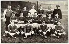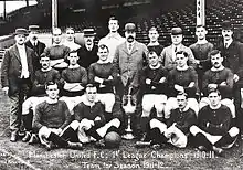 In January 1902, with debts of £2,670 – equivalent to £310,000 in 2023[2] – the club was served with a winding-up order.[3] Captain Harry Stafford found four local businessmen – including John Henry Davies, who became club president – each willing to invest £500 in return for a direct interest in running the club.[4] As a mark of this fresh start, on 24 April 1902, the club's name was changed to "Manchester United".[5][6] Under Ernest Mangnall, who became club secretary in 1903, the team finished as Second Division runners-up in 1906 and secured promotion to the First Division, which it won in 1908 – the club's first league title. The following season began with victory in the first ever Charity Shield[7] and ended with the club's first FA Cup title. Manchester United moved to a new stadium at Old Trafford in 1910, and won the First Division for the second time in 1911, but at the end of the following season, secretary Mangnall left to join Manchester City.[8]