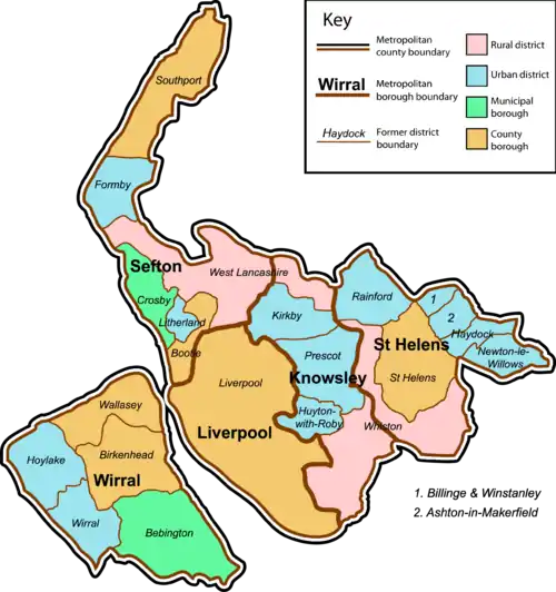 Merseyside is an amalgamation of 22 former local government districts, including six county boroughs and two municipal boroughs.