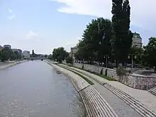 Niš (Serbian Cyrillic: Ниш, pronounced [nîːʃ] ⓘ) was built on the ruins of Roman Naissus. The Late antiquity town was known as Naissus, Νάϊσσος, Ναϊσσός (Naissos), Naessus, urbs Naisitana, Navissus, Navissum, Ναϊσσούπολις (Naissoupolis).[1][a] It originated as a hydronym (the Nišava river),[2] either of Celtic or Paleo-Balkan linguistical origin.[b] Niš evolved from the toponym attested in Ancient Greek as ΝΑΙΣΣΟΣ (Naissos), which achieved its present form via phonetic changes in Proto-Albanian and thereafter the placename entered Slavic.[3][4][5] Its common antique name in historiography is Latin Naissus. In Old Serbian, the town was known as Niš (written Нишь and Ньшь).[6]