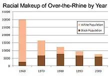 Jim Tarbell, "the most adamant and voluble opponent" of Gray's plan,[88] warned that it guaranteed the persistence of Over-the-Rhine as "a predominantly black enclave of poverty and despair", but City Council ignored him, believing the plan was a compromise.[89] Preservationists found little local support as other Cincinnati neighborhoods feared displacement would move the city's poor, and crime, closer to home. Over the next seven years the plan failed to produce balance in its residential population, nor did it attract commercial or industrial initiatives.[89][90] By 1990 Over-the-Rhine contained 2,500 government-subsidized low-income housing units (compared to virtually none in 1970)[49] and had become one of the most economically distressed areas in the United States.[91] The neighborhood had an extremely high poverty and unemployment rate, with the median household income of about $5,000 a year.[92] An estimated 84-percent of its residents were classified as low income, and over 95% of all housing units were rentals.[92]