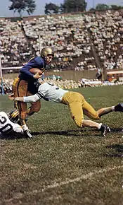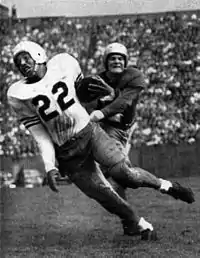 During this period, Pitt regularly dominated opposing teams, even inducing Notre Dame to drop Pitt from its schedule.[43] However, it was also during this era that the university, led by chancellor John Gabbert Bowman, began introducing policies designed to de-emphasize the athletic programs. This was manifested when a plan was instituted in the spring of 1937 by Athletic Director James "Whitey" Hagan, who had actually played for Sutherland, to eliminate university subsidies for athletes.[44] Hagan's plan was then absorbed into a 1938 athletics code of conduct, referred to as "Code Bowman", which discouraged alumni help, restricted practices to two hours a day, and eliminated both athletic recruiting and all direct subsidization of athletics.[45][46] While the implementation of these policies was the beginning of the end for that era of Pitt football prominence, the Panthers still impressed during the 1938 season behind an assembly of talent at running back labeled the "Dream Backfield." With Goldberg at fullback, Dick Cassiano and Harold Stebbins at halfback, and John Chickerneo at quarterback, Pitt won at Wisconsin, shut out West Virginia and Penn State at home and Nebraska on the road, and routed Southern Methodist. Notably, the deadlock against Fordham was finally broken as Pitt defeated the Rams 24–13 at Pitt Stadium.[47] However, Pitt was tripped up against neighboring rival Carnegie Tech and at undefeated Duke. Following the season, the split between the administration and Sutherland became complete, and Sutherland resigned in March saying "The present system of athletic administration has resulted in conditions which, for me, are intolerable." The resignation caused a firestorm in the press and among the program's supporters, and resulted in student outrage and protests. However, the athletic code was firmly implemented and Sutherland's resignation stood.[48][49]