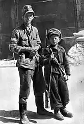 Children in the military are children (defined by the Convention on the Rights of the Child as persons under the age of 18) who are associated with military organizations, such as state armed forces and non-state armed groups.[1] Throughout history and in many cultures, children have been involved in military campaigns.[2] For example, thousands of children participated on all sides of the First World War and the Second World War.[3][4][5][6] Children may be trained and used for combat, assigned to support roles such as porters or messengers, or used for tactical advantage as human shields or for political advantage in propaganda.[1][7]