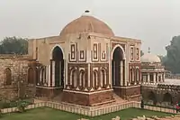 The last major Islamic tomb built in India was the tomb of Safdar Jang (1753–54). It is a brick structure clad in sandstone and marble stripped from the earlier tomb of Khan-i-Khanan (d. 1627). Shallow brick domes cover the perimeter chambers of the building, and the central dome is reportedly triple-shelled, with two relatively flat inner brick domes and an outer bulbous marble dome, although it may actually be that the marble and second brick domes are joined everywhere but under the lotus leaf finial at the top.[16]