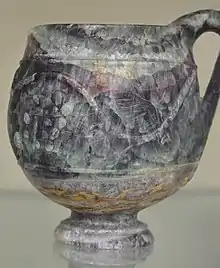 Some instances of ancient use of fluorite, main source mineral of fluorine, for ornamental use carvings exist. However, archeological finds are rare, perhaps in part because of the stone's softness. Two Roman cups made of Persian fluorite have been discovered and are currently exhibited at the British museum. Pliny the Elder described a soft stone from Persia used in cups that may have been fluorite. Fluorite carvings from about 1000 AD have been discovered in the Americas in Indian burial grounds.