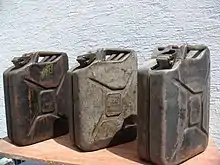 The North African campaign saw the widespread adoption of the 20 litre jerry can, a German invention that was copied by the British and Americans. The jerry can had convenient carrying handles and could be stacked. It did not shift or roll in storage, and floated in water when filled with petrol. The British version was an exact copy of the German model; the American version, called an Ameri-can by the British, was slightly smaller, with a screw cap onto which a nozzle could be fitted. It weighed 4.5 kilograms (10 lb) empty, and 18 kilograms (40 lb) when filled with petrol, so 56 filled cans weighed 1.0 tonne (1 long ton).[149] Some 11.5 million jerry cans were provided for Operation Overlord. Of these, 10.5 million were manufactured in the UK and supplied to the US Army under Reverse Lend-Lease, while the rest came from the US.[150]