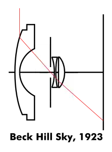 The first fisheye lens was the Beck Hill Sky (or Cloud; UK) lens of 1923. Robin Hill intended it to be pointed straight up to take 360° azimuth barrel distorted hemispheric sky images for scientific cloud cover studies.[67] It used a bulging negative meniscus to compress the 180° field to 60° before passing the light through a stop to a moderate wide angle lens.[9]: 557 The Sky was 21mm f/8 producing 63mm diameter images.[68] Pairs were used at 500 meter spacing producing stereoscopes for the British Meteorological Office.[69]