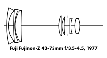 In 1977, zoom lenses had advanced far enough that the Fuji Fujinon-Z 43-75mm f/3.5-4.5 (Japan) became the first zoom lens to be sold as the primary lens for an interchangeable lens camera, the Fujica AZ-1 (1977, Japan) 35mm SLR, instead of a prime.[111]