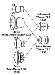 Some afocal attachments, such as the Zeiss Tele-Mutar 1.5× and Wide-Angle-Mutar 0.7× (1963, West Germany) for various fixed lens Franke and Heidecke Rolleiflex brand 120 roll film twin-lens reflex cameras, were of higher quality and price, but still not equal to true interchangeable lenses in image quality. The very bulky Mutars could change a Rolleiflex 3.5E/C's Heidosmat 75mm f/2.8 and Zeiss Planar 75mm f/3.5 (1956, West Germany) viewing and imaging lenses into 115mm and 52mm equivalents.[92][93] Afocal attachments are still available for digital point-and-shoot cameras.[94][95]