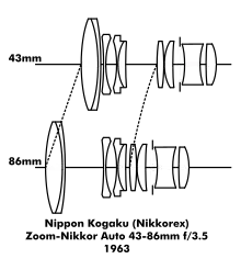 Most early zoom lenses produced mediocre, or even poor, images. They were adequate for low resolution requirements such television and amateur movie cameras, but usually not still photography. For example, Nippon Kogaku always apologetically acknowledged that Takashi Higuchi's Zoom-Nikkor Auto 43-86mm f/3.5, the first popular zoom lens, did not meet its normal image quality standards.[105] However, efforts to improve them were ongoing.