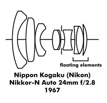 - ↑ Kouichi Oshita, "The First Lens equipped with the Close-Range-Correction Mechanism: Tale 14: NIKKOR-N Auto 24 mm f/2.8," from http://imaging.nikon.com/products/imaging/technology/nikkor/n14_e.htm Archived 2009-04-13 at the Wayback Machine retrieved 28 February 2006.