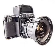 Fisheye lenses continued to be used chiefly for scientific applications; however, the first widely-seen fisheye photograph was taken by Ed Clark and published in an April 1957 issue of LIFE magazine, showing the United States Senate caucus room;[70] a few months later in the same magazine, Ralph Crane published a photograph he had taken of pole-vaulter Bob Gutowski using a Nikon fisheye camera.[71] The first widely-available fisheye lens for 35mm cameras was the Fisheye-Nikkor 8 mm f/8 from Nikon, released in 1962, which produced circular images similar to those popularized by the LIFE photographers;[72] that lens served as the "eye" of the HAL 9000 computer from the film 2001: A Space Odyssey,[73] although scenes depicting HAL's point of view were taken by a Fairchild-Curtis lens designed for Cinerama 360 cameras.[74][75] Asahi Optical followed by releasing the first "full-frame" fisheye lens in 1963, the Fish-eye-Takumar 18 mm f/11, which had a 180° angle of view across the frame diagonal.[76] Fisheye photographs became popular for album covers starting from the mid-60s and have continued to influence the music industry.[77]