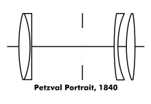 A 150mm Petzval lens was fitted to a conical metal Voigtländer camera taking circular daguerreotypes in 1841. The Voigtländer-Petzval was the first camera and lens specifically designed to take photographs, instead of being simply a modified artist's camera obscura.[1]: 37 [7][8] The Petzval Portrait was the dominant portrait lens for nearly a century. It had what would now be considered severe field curvature and astigmatism, but It was centrally sharp (about a 20° field of view, or 10° for critical applications), and it quickly drifted out of focus to a soft outer field, producing a pleasant halo effect around the subject. The Petzval Portrait remains popular as a projection lens where the narrow angles involved mean the field curvature is not significant.[9]: 823–824