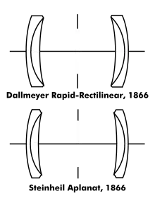 The Globe's symmetric formula directly influenced the design of the Dallmeyer Rapid-Rectilinear (UK) and Steinheil Aplanat (modern Germany). By coincidence, John Dallmeyer's Rapid-Rectilinear and Adolph Steinheil's Aplanat had virtually identical symmetric four-element formulae, arrived at almost simultaneously in 1866, all of which corrected most optical aberrations, except for spherical and field curvature, to f/8. The breakthrough was to use glass of maximum refractive index difference but equal dispersion in each achromat. The Rapid-Rectilinear and Aplanat lenses were scalable over many focal lengths and fields of view for all contemporaneous media, and they were the standard moderate-aperture, general-purpose lenses for more than half a century.[1]: 59–62 [2]: 167